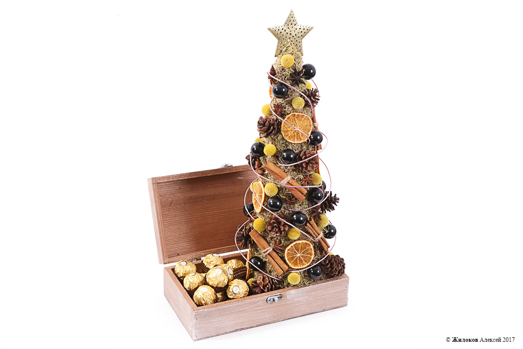 Состав: Мох сфагнум (60 г) - 1Краспедия - 20 Украшение "Шишка" - 13 Украшение на палочке - 1 Набор "Корица" (25г) - 1 Декор "Анис" - 1 Долька апельсина - 10 Жемчуг искусственный (черный) - 1 Декор - 1 Набор конфет Ferrero Rocher, 200 г - 1 Кашпо "Шкатулка низкая Лафе" - 1 |