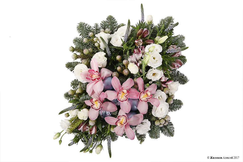 Состав: Нобилис - 6Орхидея Цимбидиум - 1 Эустома - 1 Тортум Фимейл - 1 Вероника - 10 Альстромерия - 5 Шар новогодний - 5 Кашпо "Ящик 3 рейки" - 1 |
