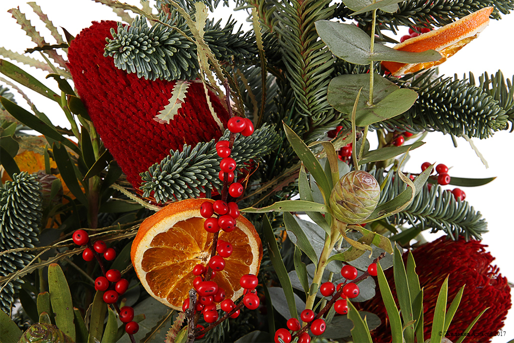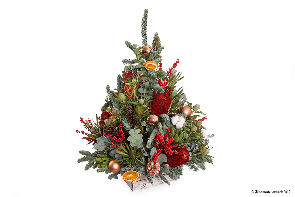 Описание: Яркая новогодняя композиция в виде елочки, украшенной экзотическими яркими банксиями, сочными дольками апельсина и россыпью красных ягод-бусин. Оригинальный подарок, который поможет создать в доме атмосферу праздника и близости настоящего чуда. |