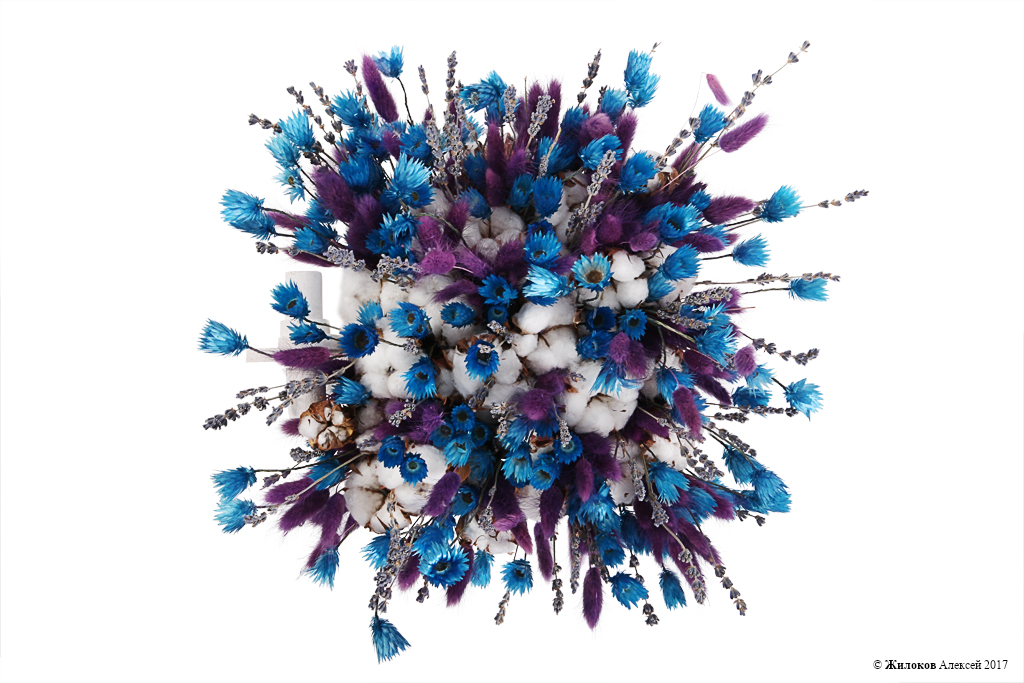 Состав: Лаванда - 1Лагурус - 1 Хлопок - 3 Эверластинг - 1 Кашпо "Велосипед" - 1 |