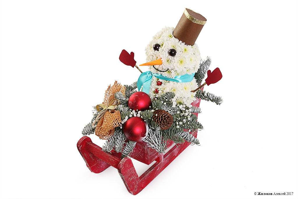 Сказочный Снеговичок из цветов, как по мановению волшебной палочки, создаст неповторимую праздничную атмосферу, наполнит дом настоящей новогодней сказкой. Такой новогодний подарок придется по нраву как детям, так и взрослым, и принесет каждому много радости и позитивных эмоций!