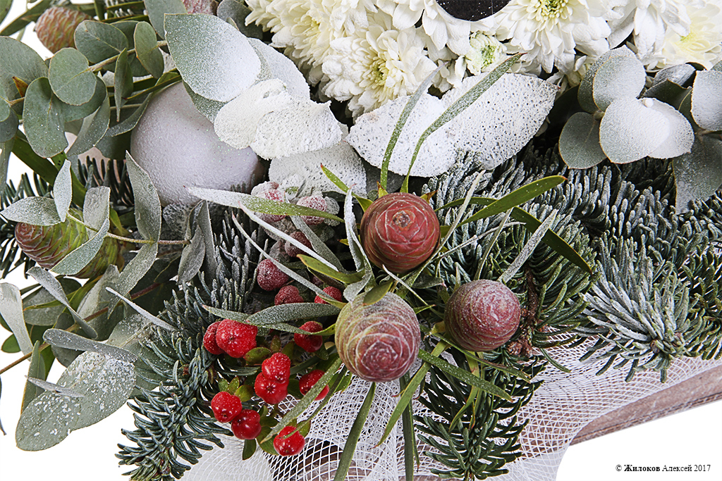 Состав: Нобилис - 1Хризантема кустовая - 25 Гиперикум - 5 Стриктум - 1 Эвкалипт - 1 Шар новогодний - 3 Кашпо "Ящик 2 рейки" - 1 |