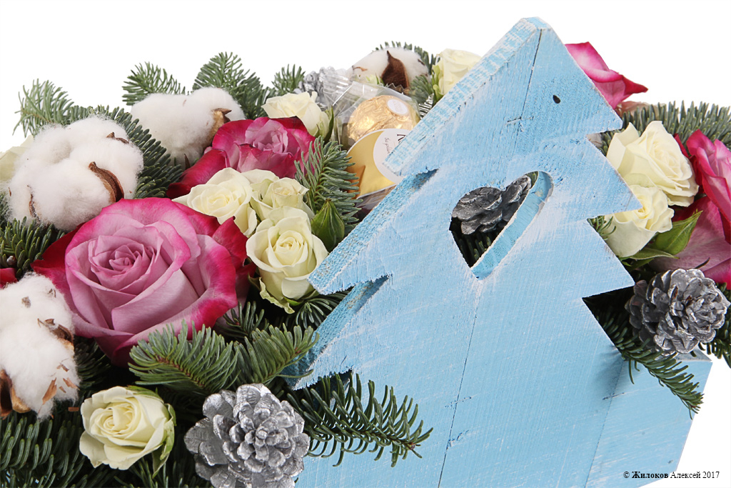 Описание: Пышная новогодняя композиция, которая создаст неповторимую праздничную атмосферу везде, где бы она не находилась. Классическое "зимнее" сочетание нобилиса, хлопка и роз выглядит изысканно, ярко и свежо. В дополнение к цветам - упаковка шоколадных конфет Ferrero Rocher, которая порадует любого сладкоежку. |