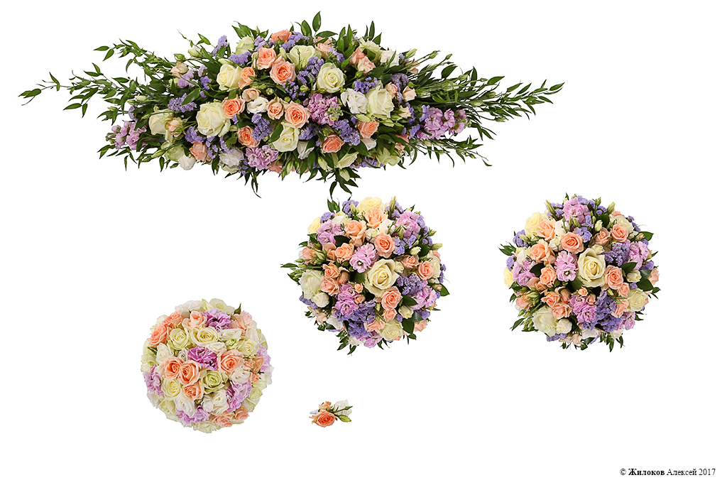 В данный комплект входят: букет невесты, бутоньерка, президиум, 2 композиции.